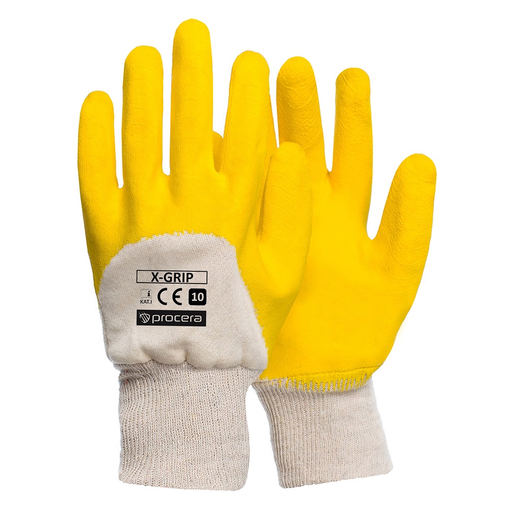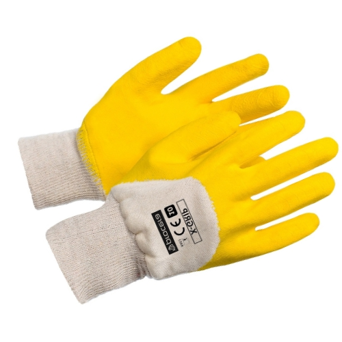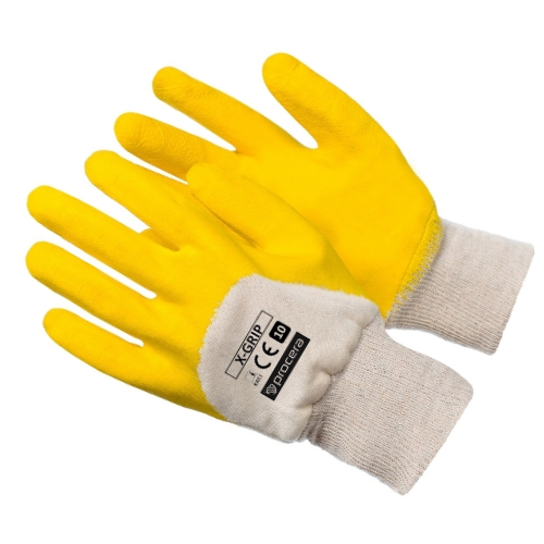 Rękawice X-GRIP wykonane z dzianiny bawełnianej, powlekanej w części chwytnej oraz w części wierzchniej 3/4 lateksem o szorstkowanej strukturze w kolorze żółtym. Bardzo dobra przyczepność. Duża wytrzymałość na ścieranie. Zakończone ściągaczem. CE KAT I