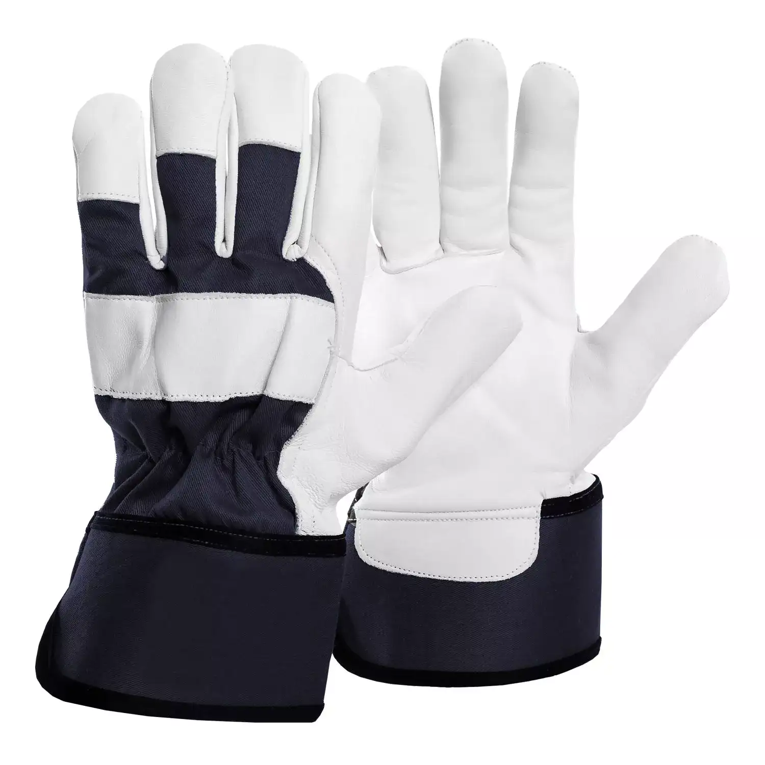 • wykonane w części chwytnej z jednego kawałka najwyższej jakości licowej skóry koziej, wierzch wykonany z tkaniny w kolorze granatowym, ze skórzanym wzmocnieniem w linii kości śródręcza
