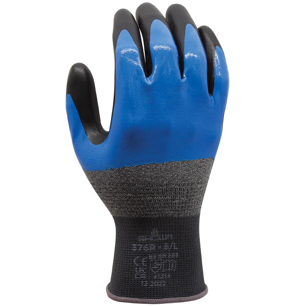 Rękawice SHOWA 376R są wyposażone w innowacyjną, dwuwarstwową nitrylową powłokę zewnętrzną, która skutecznie zapobiega przesiąkaniu cieczy. Pierwsza warstwa tworzy solidną barierę ochronną, podczas gdy druga, z pianki nitrylowej, zlokalizowana na dłoniach, zwiększa chwytność nawet przy pracy z tłustymi i śliskimi przedmiotami.